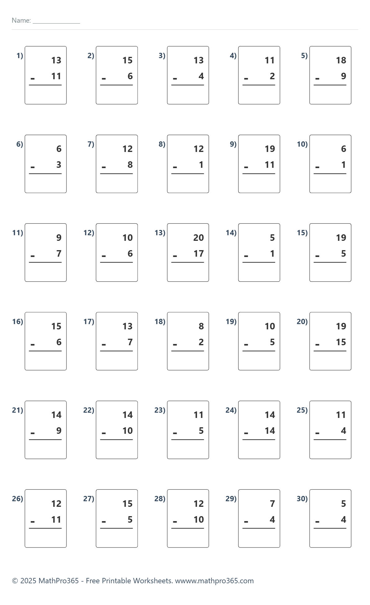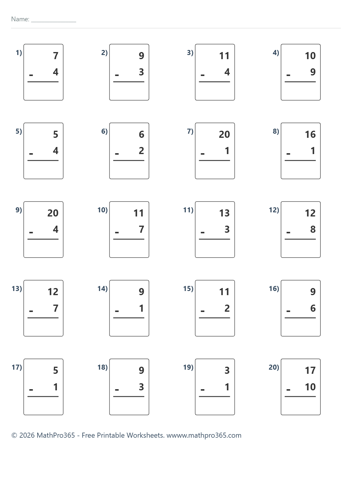 Subtraction Within 20 – No Borrowing (Grade 1) – Free Printable