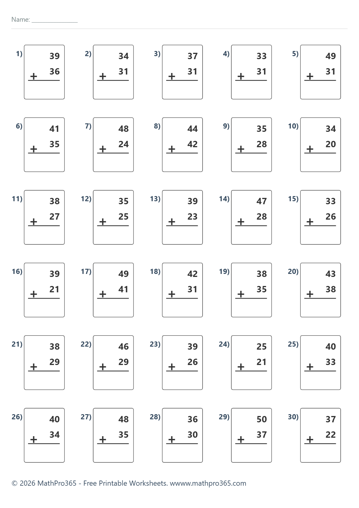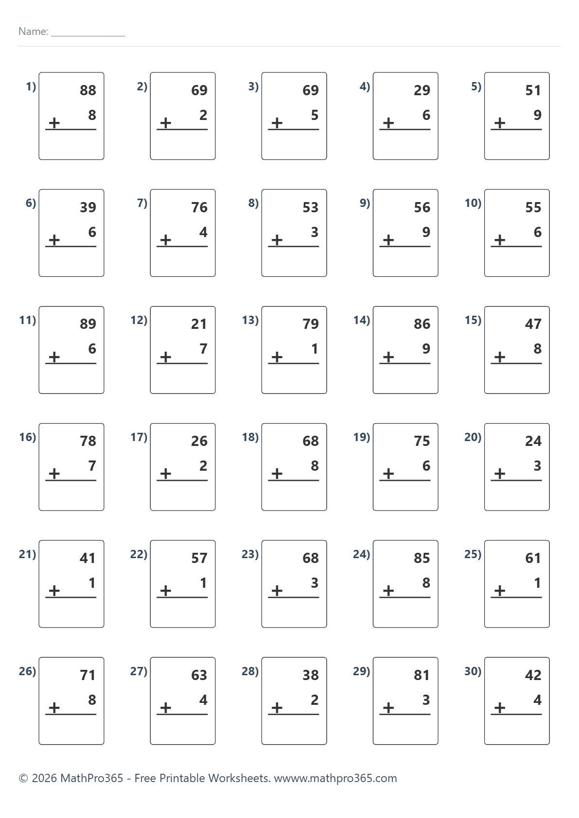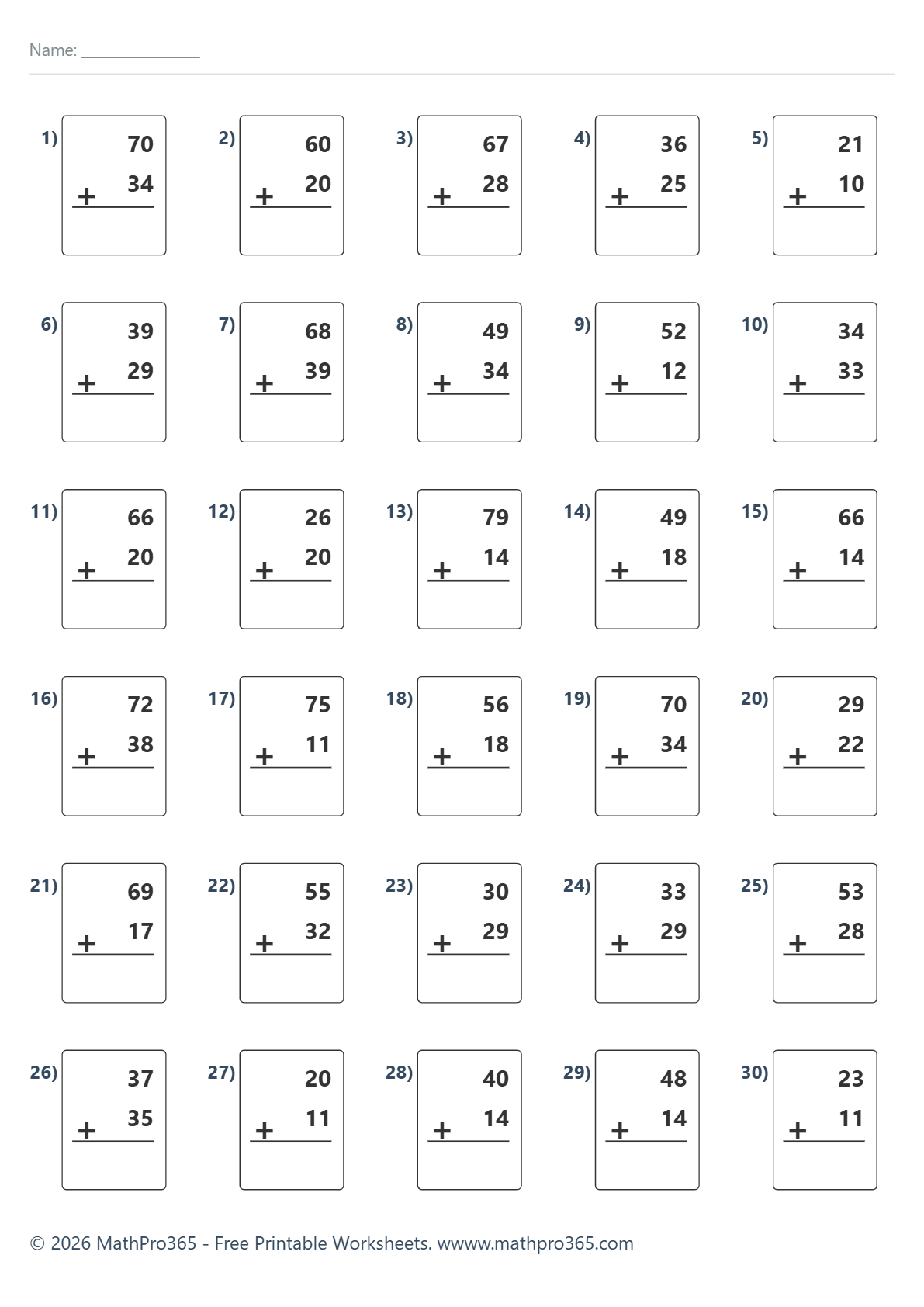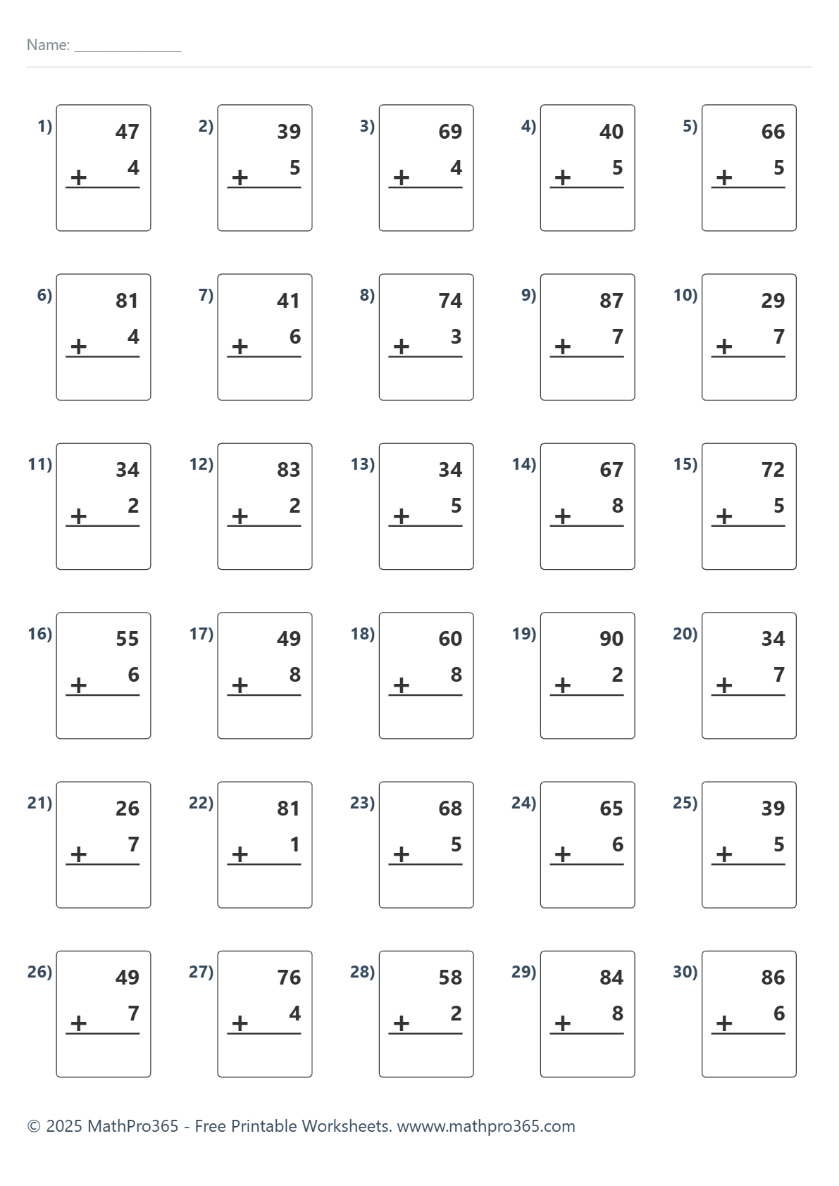 Addition Within 100 — No Regrouping (30 Problems) – Free PDF