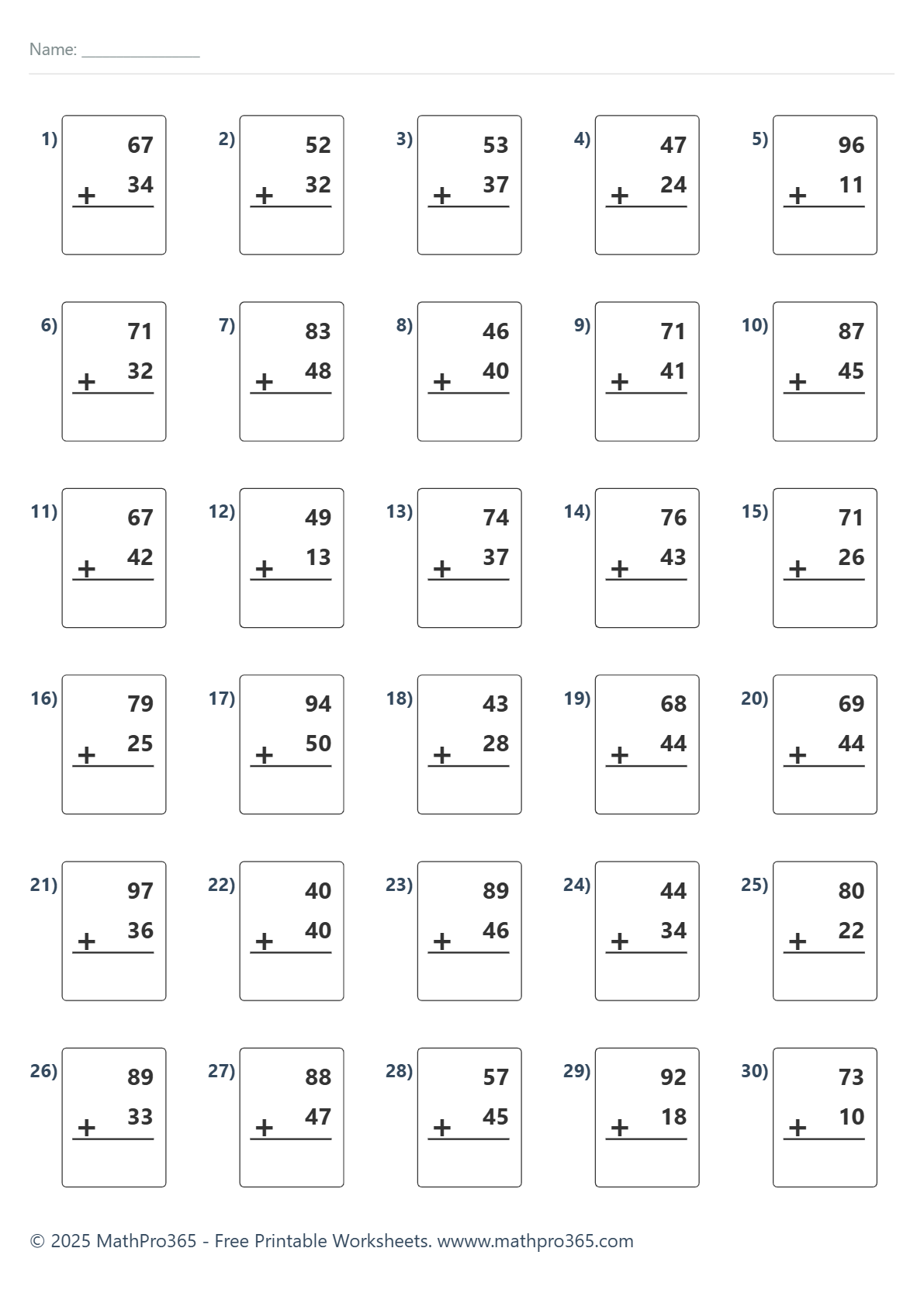 Addition Within 100 — No Regrouping (30 Problems) – Free PDF